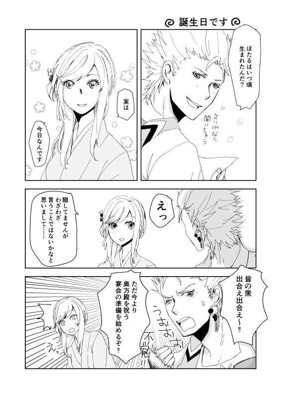 乙女ゲーらしく「ほたるちゃん=自分」の設定だよ☆下天にはないけど、ゲームによっては誕生日設定する作品もありますよね。そんなイメージです。でも、ほたるちゃんと自分の共通点って性別くらいしかないね(震え声)。美少女でスタイルも良くて忍びとしても優秀で、鋭いツッコミもできるし、でも年相応の多感な女の子よね。一ミリも重ならないわ!!ほたるちゃんのお誕生日漫画も描いてみたいです(自分は関係なしに)。こういう漫画を描いておいてアレですが、私自身は主人公は一キャラとして見るので、意識した自己投影は一切ないです。はい。